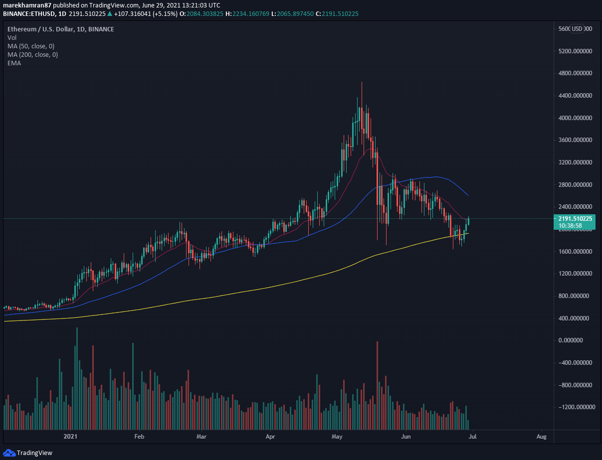 V čase písania tohto článku sa cena ETH pohybovala na úrovni 2191 USD.
