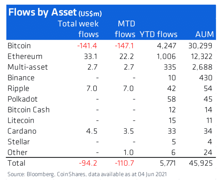Medvediemu trendu určitým podielom prispievajú aj inštitucionálny investori. V predchádzajúcom týždni stiahli z investičných produktov Bitcoin v rekordnej hodnote 141 miliónov USD. Podľa najnovšej správy analytickej spoločnosti CoinShares zo 7.júna bude odlev naďalej pokračovať a prudko rásť.