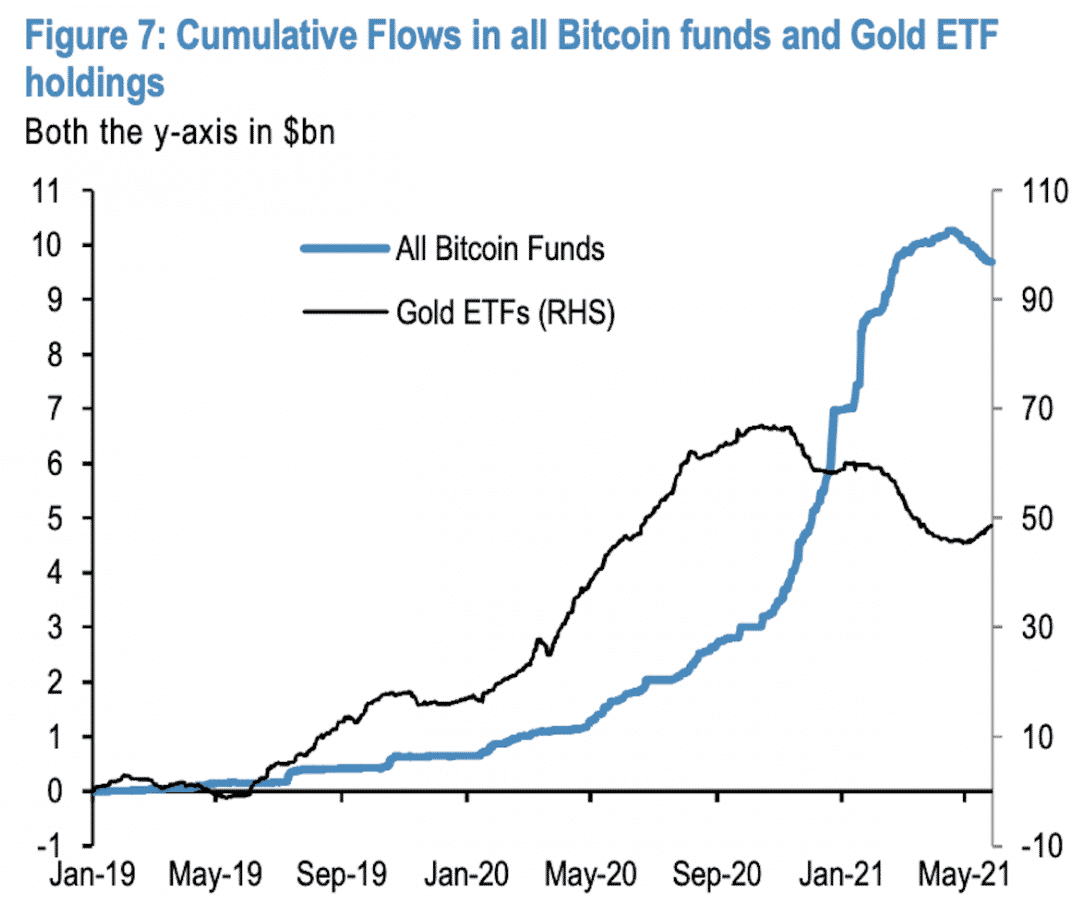 „Fondy, ktoré sa obchodujú s Bitcoinom zaznamenávajú neustály odlev a naopak u fondov spojených so zlatom evidujeme neustály prílev financií. Tento fakt môže naznačovať odlúčenie inštitucionálnych investorov od Bitcoinu a návrat k tradičnejšiemu zlatu,” uvádza sa v správe analytika JPMorgan Nikolaosa Panigirtzogloua.