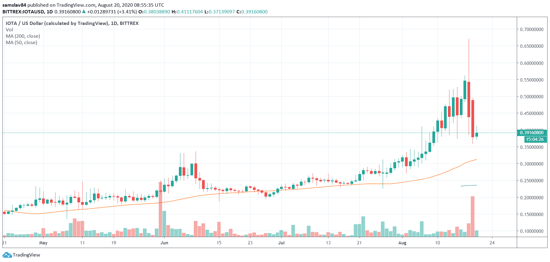 IOTA je v roku 2020 bullish a z dna 4-7 centov sa dostala až na súčasných 0,4 $. Najväčší rast zaznamenala v auguste.