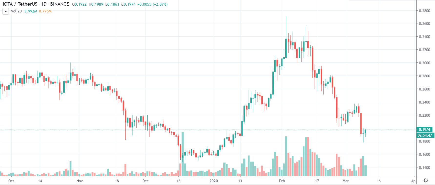 Cena tohto coinu v súčasnosti klesá, podobne ako zvyšok trhu. IOTA však korekciu znáša o to ťažšie, že musí čeliť negatívnym fundamentom a takmer mesačnej odstávke siete. Veľa obchodníkov tak zlikvidovalo svoje pozície v tomto projekte.