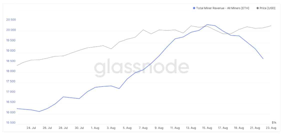 Po spustení hard forku môžeme prvýkrát reálne posúdiť, ako sú na tom mineri. Za posledných 10 dní sa celkové zisky znížili z 21 000 ETH na 17 500 ETH. Najväčší vplyv na pokles príjmov môžeme jednoznačne pripisovať procesu spaľovania poplatkov. Príjmy zo samotných poplatkov totiž klesli až o 14 %. Aktuálne sa pokles pohybuje na úrovni 22 % a naďalej klesá.