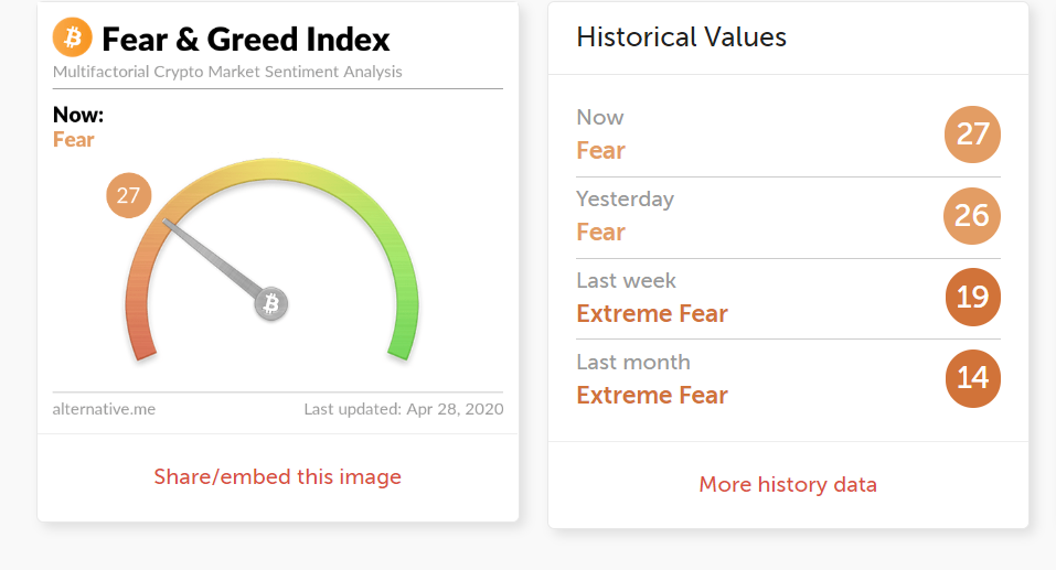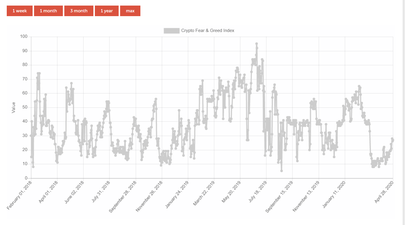Na obrázku môžeme vidieť, že hodnoty tohto indikátora od začiatku minulého mesiaca rapídne rastú. Zatiaľ čo v marci sa pohyboval tesne pod 15 bodov, teraz je na 27. Ak tento trend bude pokračovať, do leta budeme opäť po roku v Greed zóne, čo znamená „bezpečný” rast BTC až do chamtivej zóny. Ak by sa tak stalo, môžeme naopak špekulovať nad predajom, respektíve sa obávať, či cena BTC nie je veľmi nafúknutá fomo efektom.