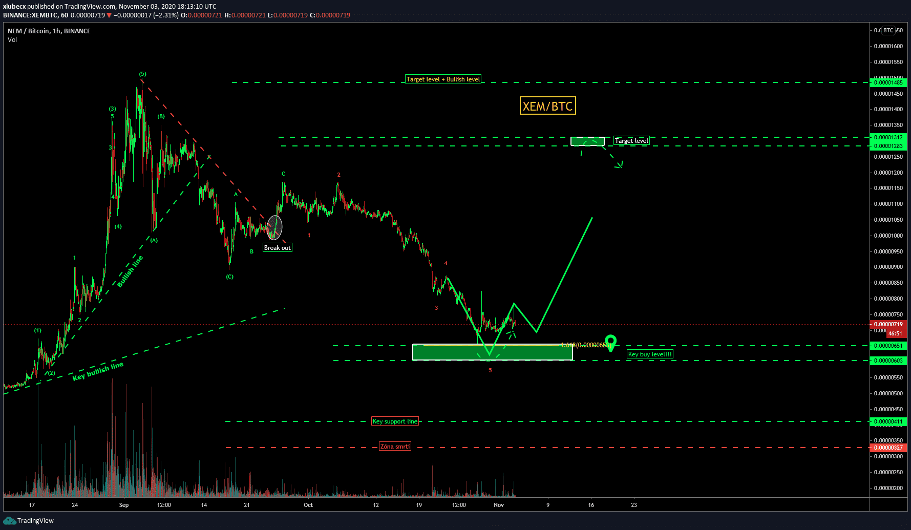 Zaujímavý príklad korekčného pohybu môžeme vidieť na grafe altcoinu XEM. Postupne sa vraciame späť na lokálne low, kde sa vlastne celý cyklus aj začal. Takýto cenový vývoj je úplne štandardný a presne na tomto dne, ktoré je okolo 500 satoshi chceme vstupovať do obchodu.