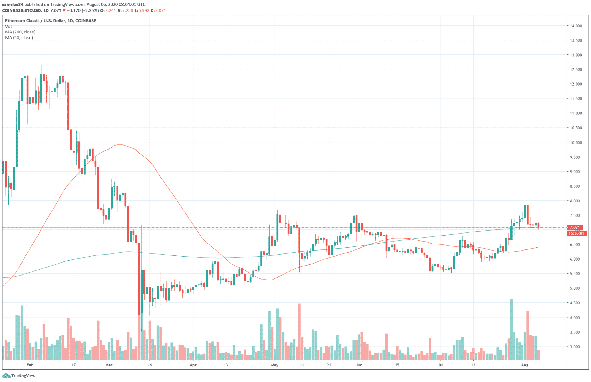 Cena ETC na útok veľmi nereaguje, no v posledných dňoch sme postrehli mierny prepad. Veľká červená svieca, ktorú vidíte, však bola spôsobená nedávnym flash crashom Bitcoinu. Za posledných 24 hodín cena ETC klesla o 1%