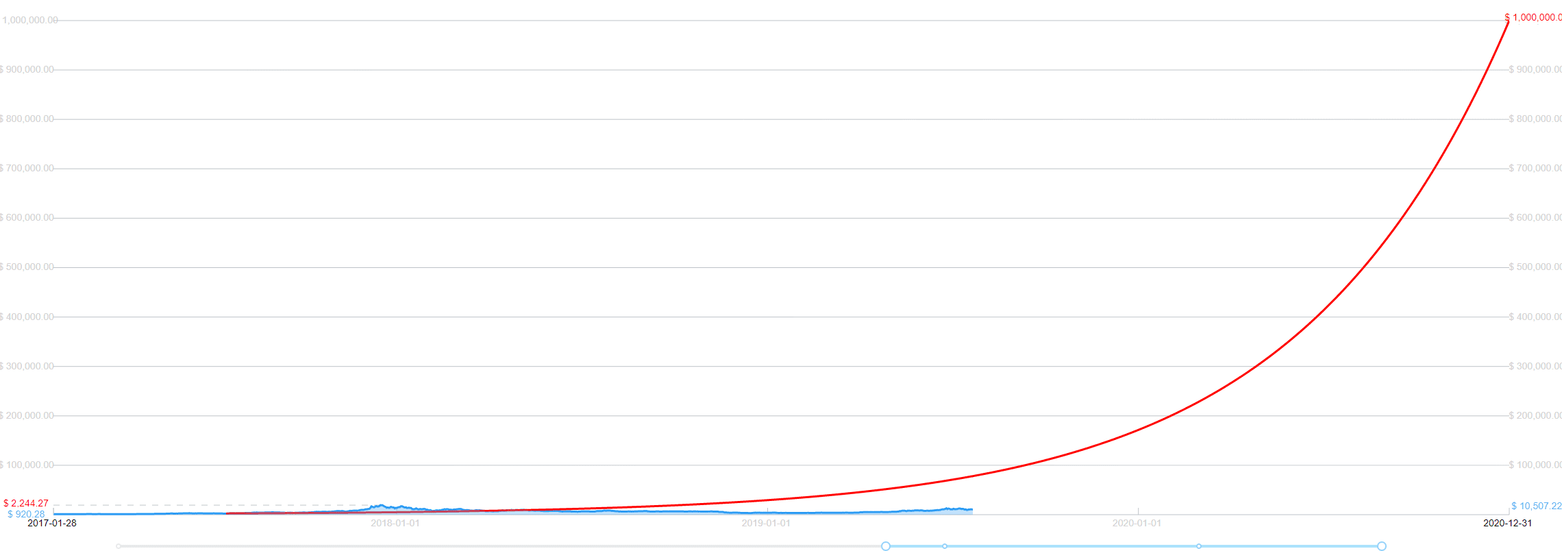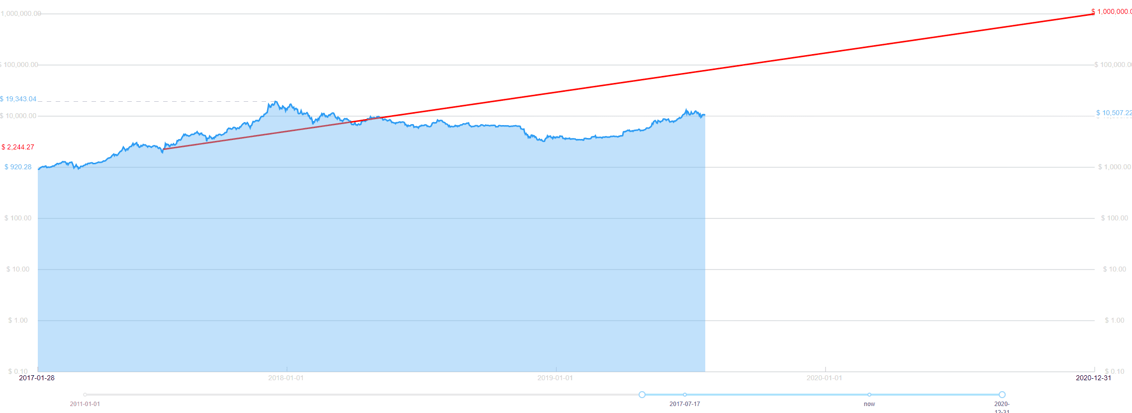 Ako to teda vychádza? Nie práve najlepšie. Na tomto logaritmickom grafe je zakreslený predikovaný vývoj ceny (červená čiara) a skutočnosť (modrý graf).