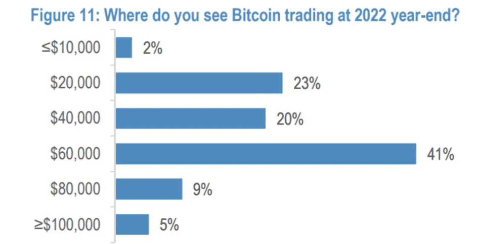 Jedna z najväčších investičných bánk na svete má svoje predpovede cien BTC pripravené na rok 2022. V nedávnom prieskume sa JPMorgan Chase spýtal svojich klientov: Kde vidíte obchodovanie s bitcoinmi na konci roka 2022? Len 5 % uviedlo, že digitálna minca dosiahne 100 000 USD. 9 % uviedlo, že prekoná predchádzajúce historické maximum a dosiahne viac ako 80 000 USD.