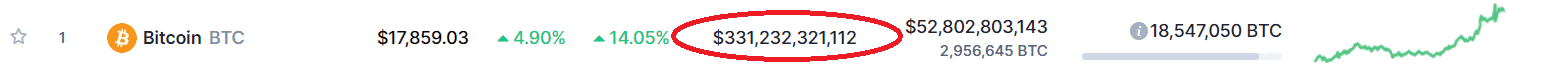 To sa však zmenilo, keď Bitcoin včera zaklopal na dvere rezistencie 18 000 $. Aj v čase písania tohto článku je jeho kapitalizácia vyššia, než bola v roku 2017. Viac než 331 miliárd dolárov!
