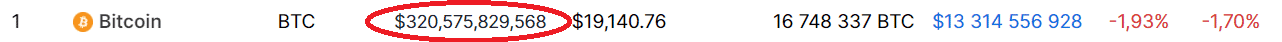 Na snapshote je zobrazená kapitalizácia pri cene 19140,76 $. Na burze Bitstamp však Bitcoin dosiahol až 19650 $. Jednoduchým výpočtom sa dá zistiť, že maximálna kapitalizácia Bitcoinu sa donedávna pohybovala okolo $330 miliárd.