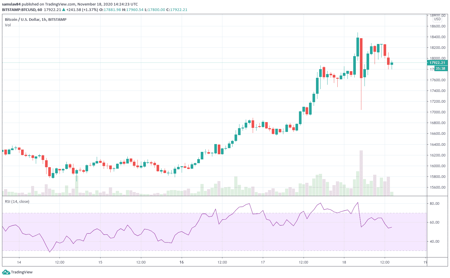Novinka o dosiahnutí nového historického maxima v kapitalizácii očividne dorazili aj na trh. Bitcoin dnes začal mierne klesť a z 18 500 $ sa prepadol na súčasných 17 800 $. Dnes však v priebehu jednej bláznivej hodiny stihol otestovať aj 17 000 $.