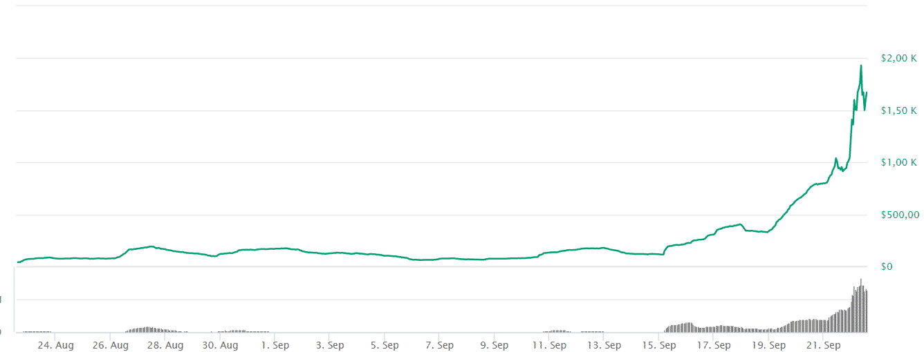 Niekto však rýchlo vytvoril rovnomerný ERC-20 token a zalistoval ho na Uniswape pod tickerom MEME. 28 000 tokenov bolo formou airdropu rozdistribuovaných v komunite. Každý záujemca dostal 250 MEME. Málokto však tušil, že hodnota jednej mince o pár týždňov dosiahne 1700 $.