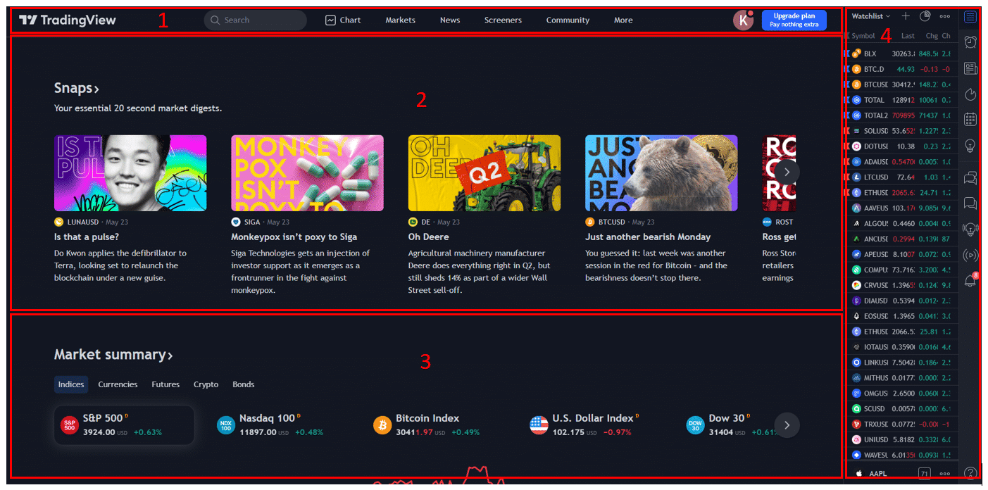 - Zhrnutie trhov – Zhrnutie trhov predovšetkým poskytuje rýchly náhľad do diania na úrovni globálnej ekonomiky. Vidíme tu v prvom rade denné zmeny indexov, ale aj iných trhov. Ak sa v tejto časti dostanete nižšie, môžete tu vidieť aj jednotlivé príspevky používateľov TradingView. Viete sa tu inšpirovať rôznymi analýzami.