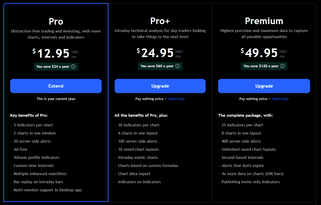 Ako už bolo vyššie spomenuté, TradingView je zadarmo pre každého. Existujú však aj platené verzie, ktoré zvyšujú počet dostupných ukazovateľov a grafov, ktoré si môžete súčasne prezerať. Pre začiatočníkov je dobrým začiatkom bezplatný účet s jedným grafom a tromi ukazovateľmi. Budete sa tiež musieť zmieriť s reklamami, aj keď nie sú príliš rušivé. Nižšie si môžete pozrieť ďalšie podrobnosti o rozdieloch v jednotlivých platených balíkoch: