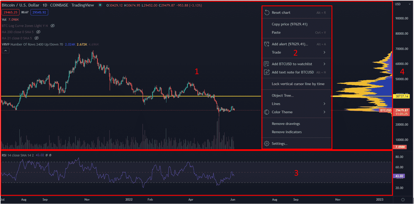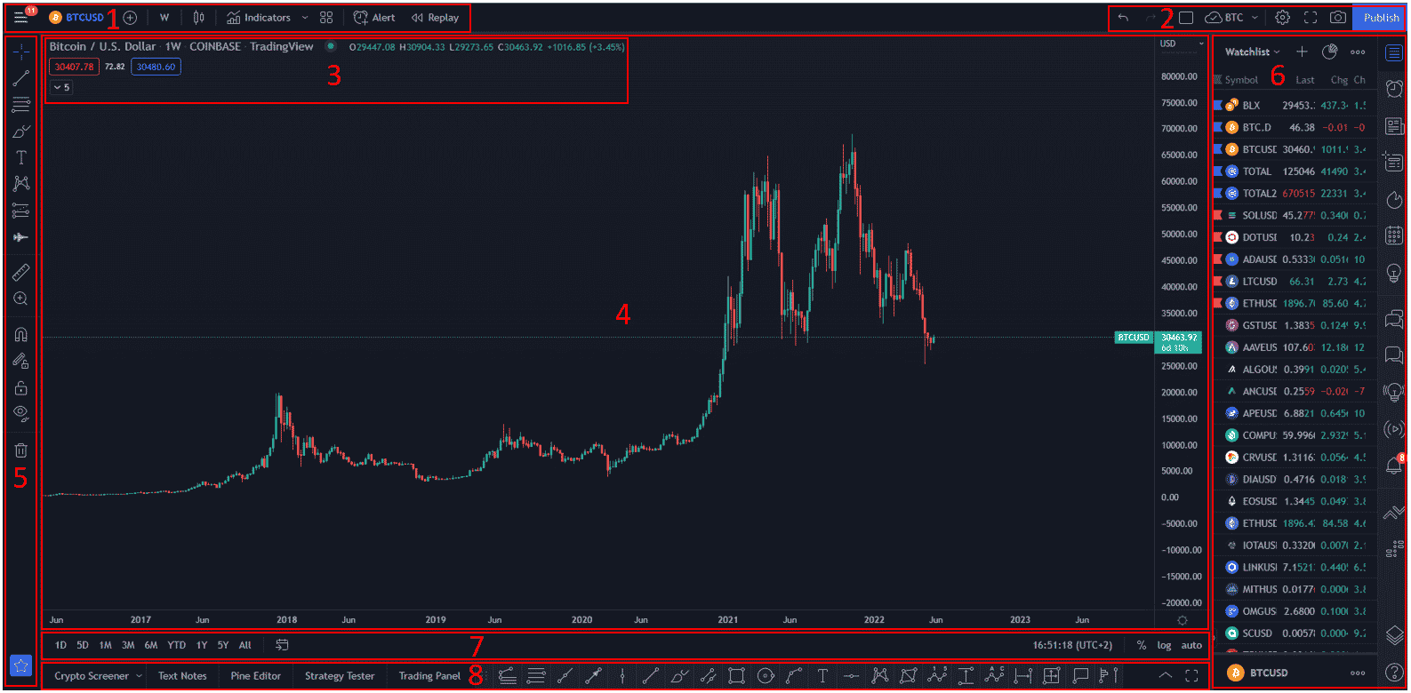 Po úspešnom otvorení konkrétneho grafu sa dostávame k jednotlivým možnostiam modifikácie grafu. Najdôležitejšia kapitola celého návodu na platforme TradingView je rozhranie grafu a jeho všetky možnosti. Obrázok nižšie poskytuje lepší prehľad o tom, kde viete nájsť jednotlivé sekcie. Pôjdeme krok po kroku a vysvetlíme si všetky detaily a zároveň si prejdeme aj niektoré užitočné tipy, ako správne používať nástroje, ktorými upravujete graf.