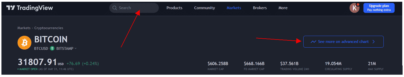 V prvom rade je potrebné vybrať si aktívum, ktoré chceme analyzovať. To docielite pomocou horného nástroja Search. Po rozkliknutí vás TradingView presmeruje na samotný graf. Druhou možnosťou je tlačidlo See more on advanced chart.