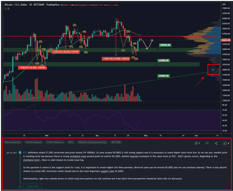 Táto komunitná časť nápadov ponúka aj kombinácie pokročilých funkcií grafov a tlačidiel spätného prehrávania, aby sme videli, ako sa darilo obchodom. Je tu otvorená spätná väzba od komunity a nemožno vymazať predikcie, ktoré nevyšli. To, ako sa publikuje graf, sme si povedali v predošlých kapitolách. Príklad takejto komunitnej analýzy je zobrazený nižšie.