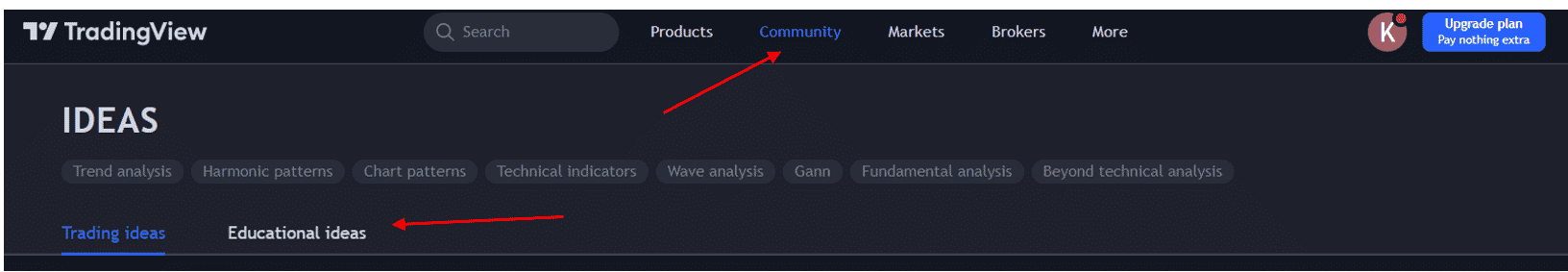 Samostatnú kapitolu budeme venovať komunitným analýzam. Ide totižto o jednu zo základných funkcionalít platformy TradingView. Do tejto sekcie sa viete dostať pomocou domovskej stránky cez záložku Community. Následne vidíte možnosť Trading ideas a Educational ideas.