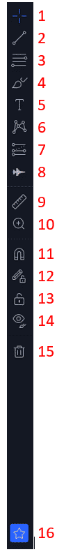 V tejto časti sa budeme venovať jednotlivým nástrojom kreslenia a v skratke si vysvetlíme, v ktorej časti viete nájsť jednotlivé možnosti modifikácie grafu. Navyše, tento zoznam obsahuje po rozkliknutí jednotlivých ikoniek väčšinou ešte ďalší podzoznam mnohých nástrojov kreslenia. Nasledujúci obrázok zobrazuje tento zoznam s číselným označením pre lepšiu orientáciu.