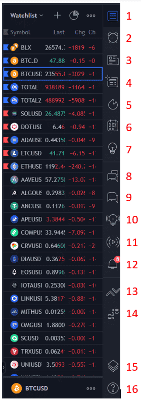 Táto sekcia slúži predovšetkým na pozorovanie cenových výkyvov vášho zoznamu aktív, no ponúka mnoho ďalších funkií, o ktorých si v skratke povieme niečo viac. Na obrázku vidíte 16 bodov, ktoré si postupne vysvetlíme, pričom už prvý poskytuje práve spomínaný zoznam vaších aktív.