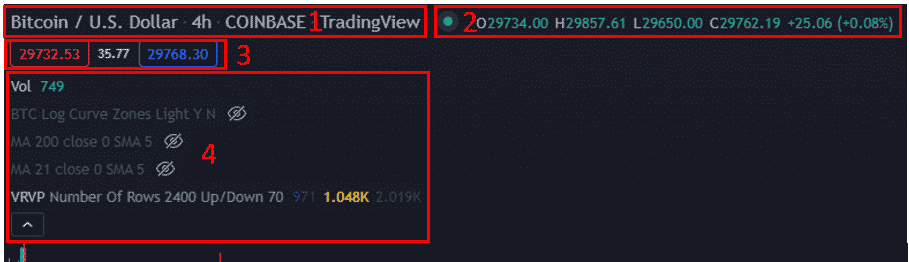 - V tejto časti môžete vidieť aktívum, ktoré analyzujete. Hneď za tým je časová perióda a burza, na ktorej aktívum analyzujete.