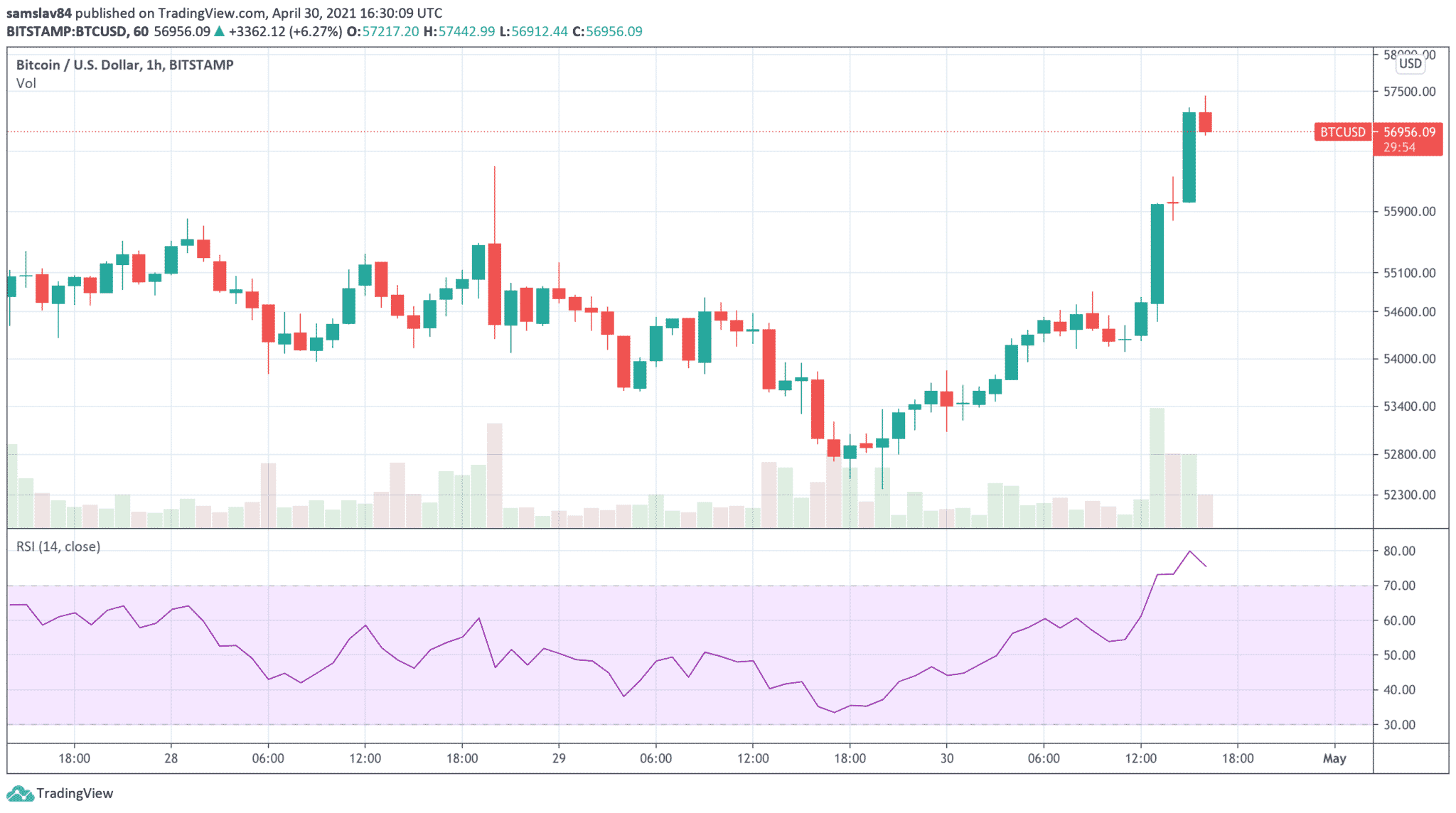 Dnes je na trhu s kryptomenami dobrá nálada. Po tom, čo Ethereum dosiahlo nové historické maximum, sa konečne pohol aj Bitcoin. 12. dní po historicky najväčšom prepade (-7500 USD behom hodiny) opäť stúpa a dnes sa už obchoduje za 57 000 dolárov. Hodnota Bitcoinu stúpla o 6,5% z hladiny 54 000 USD, kde konsolidoval v posledných týždňoch.