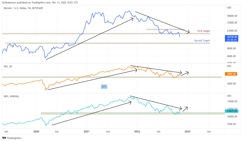 Korelácia Bitcoin, SPX a Nasdaq. Zdroj: TradingView/MJShahsavar