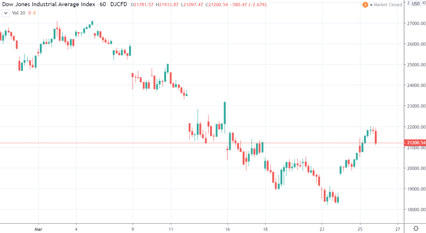 Akciové indexy včera mierne poskočili. Zdá sa, že americká ekonomika nateraz našla dno. Dow Jones Industrial Index, ktorý sleduje jej stav totiž poskočil na 21200 bodov.Dostal sa tam po tom, čo v utorok padol na dno – 18 200 bodov.