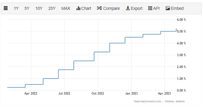 Hodnota úrokovej sadzby sa v čase písania článku vyšplhala v USA podľa údajov Tradingeconomics  už na 5,25 %. Naposledy boli na takej vysokej úrovni ešte počas finančnej krízy v roku 2009.