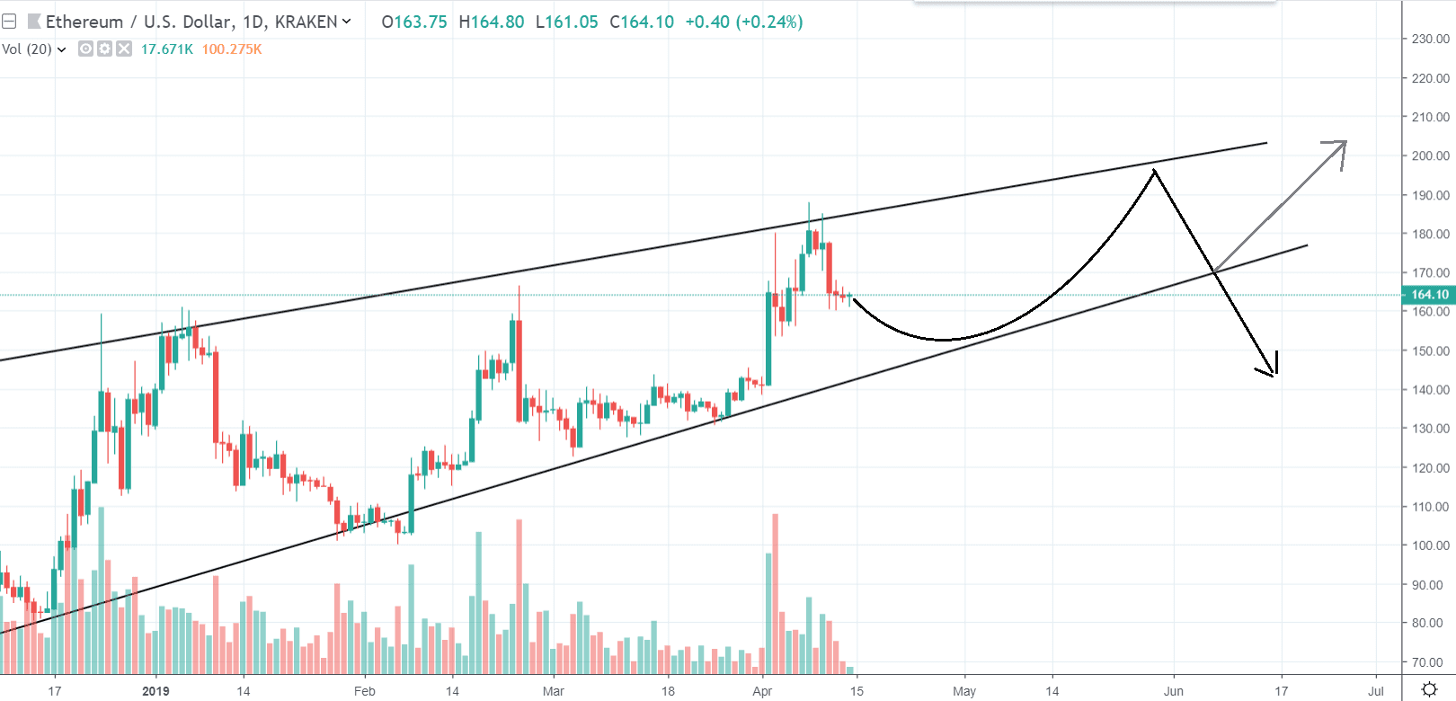 Ethereum sa štyri mesiace pohybuje vo formácii stúpajúci klin. Vývoj ceny tejto kryptomeny je charakteristický stúpajúcimi lokálnymi minimami a mierne rastúcimi lokálnymi maximami. Ethereum má problém otestovať hodnotu 200 $. Prechod cez túto cenu je dôležitý, ak chceme vidieť ďalší rast. Pokiaľ sa tak nestane, Ethereum bude v treťom kvartáli zažívať ťažké časy a hrozí mu väčší pokles po vypadnutí z formácie.