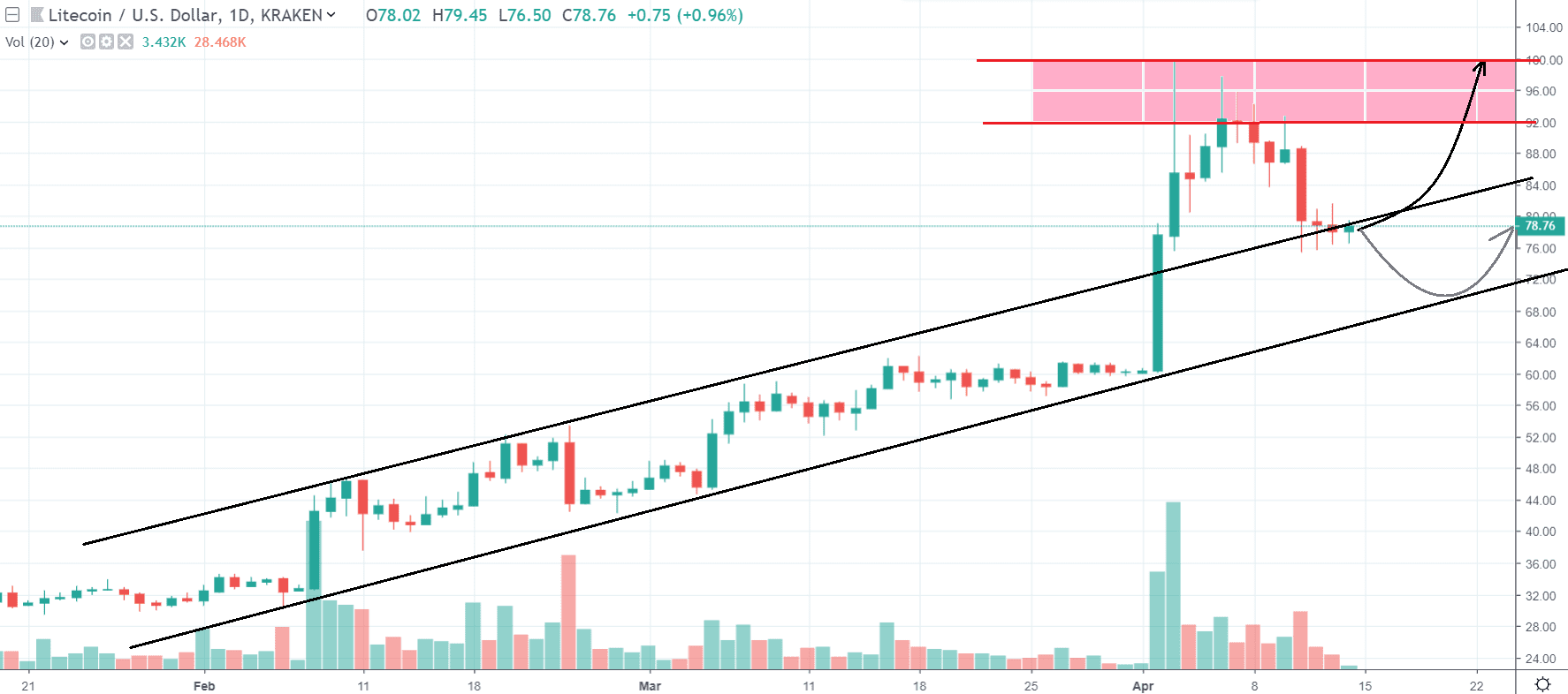 Litecoin udržal tempo nastolené v marci. Nakoniec sa vyšplhal až na hodnotu 100 $, od ktorej sa odrazil. Momentálne túto kryptomenu obmedzuje rezistenčné pásmo v oblasti 92 – 100 $, ktoré ešte bude veľmi problémové. Litecoinu by v jeho prerazení mohla pomôcť ďalšia pumpa Bitcoinu.