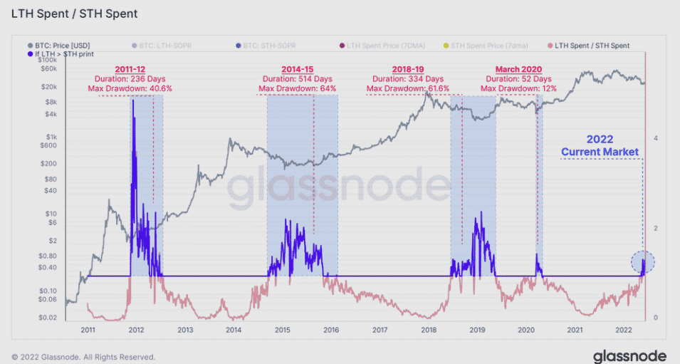 Nižšie uvedený graf porovnáva LTH s STH a môžeme vidieť, že LTH sa v súčasnosti zbavujú mincí s vyššou cenovou základňou ako STH. Predchádzajúce prípady takejto situácie sa zhodovali s formovaním absolútneho dna korekcie.