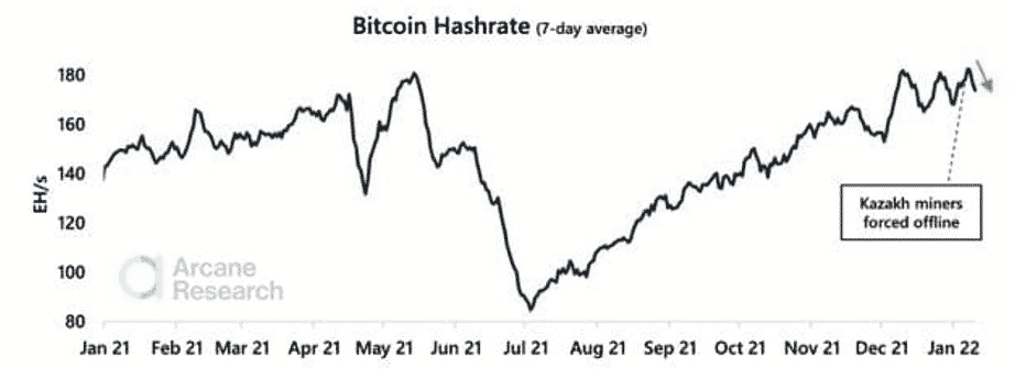 Výskumná spoločnosť Arcane Research považuje udalosti v Kazachstane a ich vplyv na BTC za náhodu. Sieť stratila omnoho viac v čase, keď sa kríza vyvíjala, a nie v čase vypuknutia.