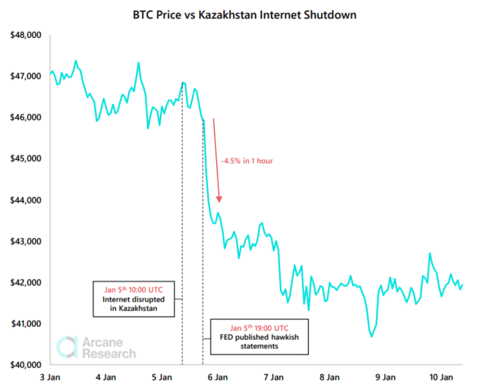 Tejto problematike sa venovala spoločnosť Arcane Research, ktorá sa vo svojej najnovšej správe snaží preukázať, že pokles vôbec nesúvisel s krízou v Kazachstane. Na uvedenom grafe môžeme vidieť, že cena BTC v čase vypnutia internetu neklesla ani o 1 000 USD. Odohralo sa to 5. januára približne o 10:00 UTC. Skutočný vplyv môžeme skôr hľadať vo vyjadreniach Fedu. Ten naznačil zvýšenie úrokových sadzieb a zúženie svojho programu pre nákup aktív.
