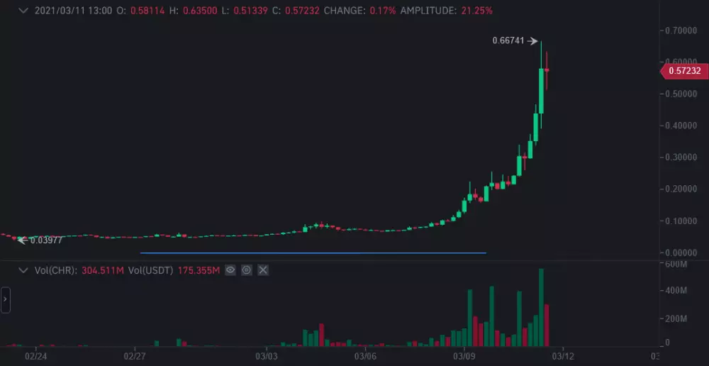 Už vo včerajšom článku som načrtol, že vďaka CHR si môžete predfarmiť token ALICE, ktorý príde na burzu Binance až 15.3. v ranných hodinách. Najviac sa tento token oplatí farmiť práve v CHR poole, pretože je tam najmenší objem prostriedkov a teda pomer odmien je výrazne najvyšší. Oproti BNB poolu viete pomocou CHR farmiť 10-15x rýchlejšie. Zrejme tento fakt, ako aj veľký záujem o Alice spôsobili to, že dopyt po CHR rapídne stúpol a vzhľadom na jeho nízku kapitalizáciu cenu prirodzene vystrelila nahor.