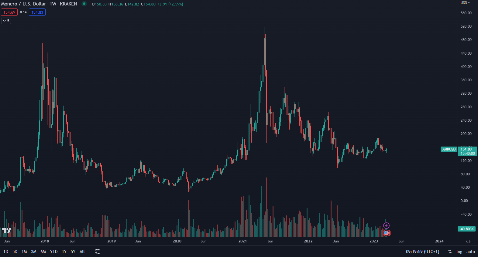 Niektoré centralizované burzy a obchodné platformy dokonca zakazujú obchodovanie anonymných mien, z dôvodu neschopnosti vystopovať históriu transakcií. Podľa údajov z TradingView, sa trhová cena v čase písania článku nachádza na úrovni 155 dolárov, čo je presne o 70 % nižšie od maxima z mája 2021.