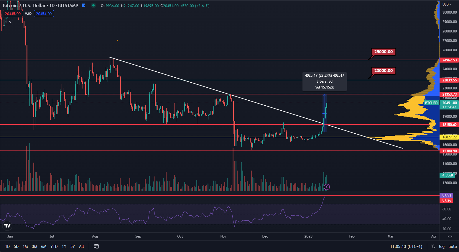 Bitcoin narástol o 23 %. Zdroj: TradingView