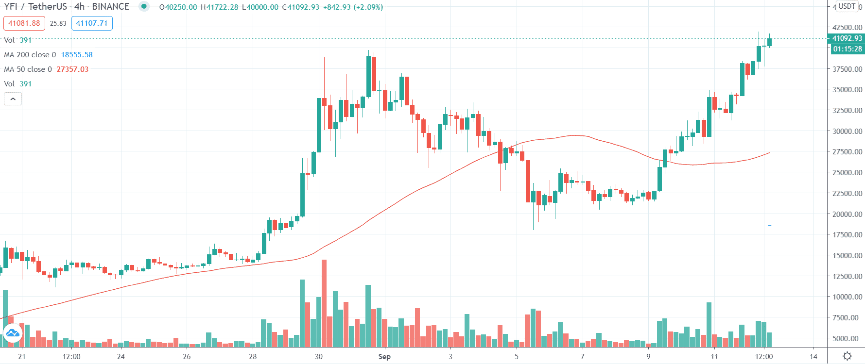 Tretím dnešným altom ktorý vykázal dvojciferné zisky je yearn.finance (YFI). Ide o natívnu kryptomenu rovnomenného DeFi projektu, v ktorom je v súčasnosti uzamknutých cca 800 miliónov dolárov a čo z neho robí piaty najväčší DeFi projekt.. DeFi altcoiny v posledných mesiacoch zaznamenali veľký rast vďaka prílevu kapitálu do tohto sektora.