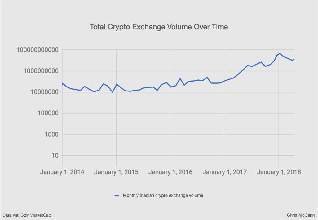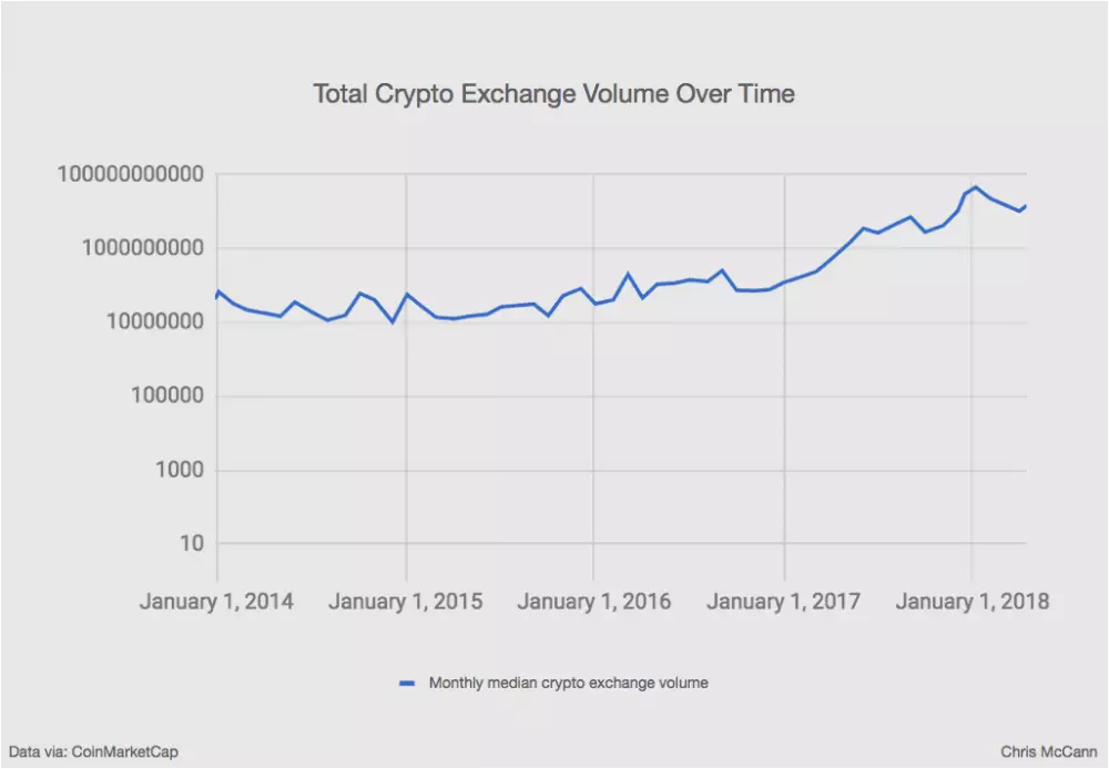 Skôr ako sa dostaneme k porovnaniu s internetom, pozrime sa aj na celkový objem obchodovania so všetkými kryptomenami od roku 2014 do roku 2018. Hodnoty boli spriemerované za mesiac, pre lepší prehľad o celkovej trendovej línii.