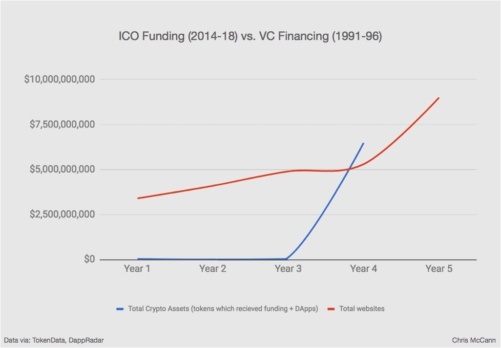 Pozrime sa na posledné porovnanie. Celkový počet kryptoprojektov, ktoré získali finančné prostriedky od roku 2014 do roku 2017 voči počtu začínajúcich internetových stránok, ktoré získali finančné prostriedky od roku 1991 do roku 1995.