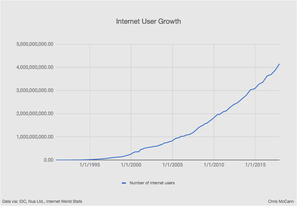 Teraz sa môžeme  pozrieť na rast internetu a odhadnúť, kde sa v tejto trajektórii kryptomeny nachádzajú.