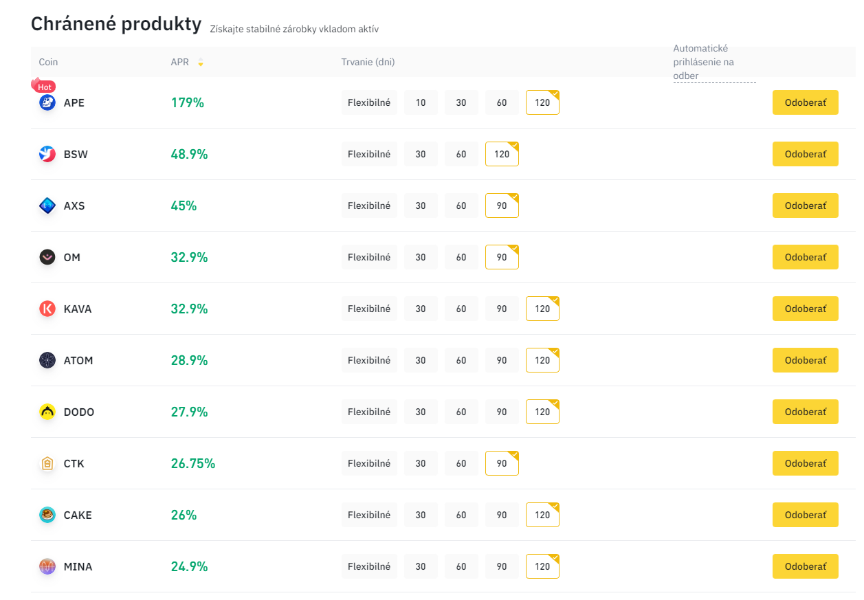 Prvá možnosť s vyššou odmenou je na burze Binance. Tu môžeme získať odmenu až do 179 % p.a. Veľká časť kryptomien je dokonca s priemerným ziskom od 15 % za rok. Nevýhodou je, že v niektorých prípadoch si staking musím predlžovať manuálne.