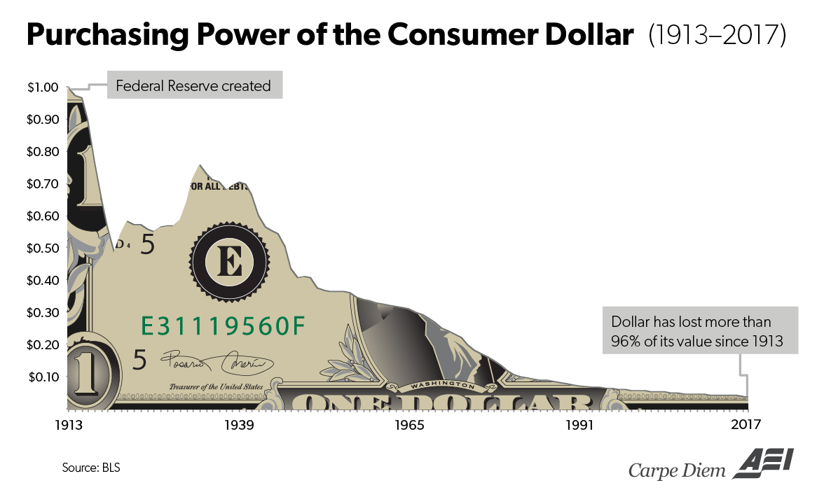 Podľa štatistiky, ktorú uverejnil American Enterprise Institute, medzi rokmi 1913 a 2017 stratil americký dolár viac ako 96 % kúpnej sily. To znamená, že 1 dolár z roku 1913 sa rovná dnešným 30,07 dolárom s priemernou ročnou mierou inflácie 3,17 %. Posledné storočie sme zaznamenali cenový nárast až 2 907,18 %.
