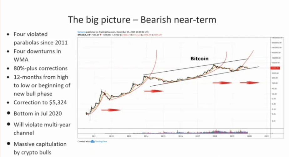 Low by sme tak dosiahli niekedy v júni 2020. Potom však môžeme očakávať veľmi rýchly rast. Bitcoin vo svojej histórii štyrikrát predviedol parabolický rast. Následne vždy trvalo rok, než sa spamätal z prasknutia bubliny. Posledná parabola bola prerazená v júni 2019.