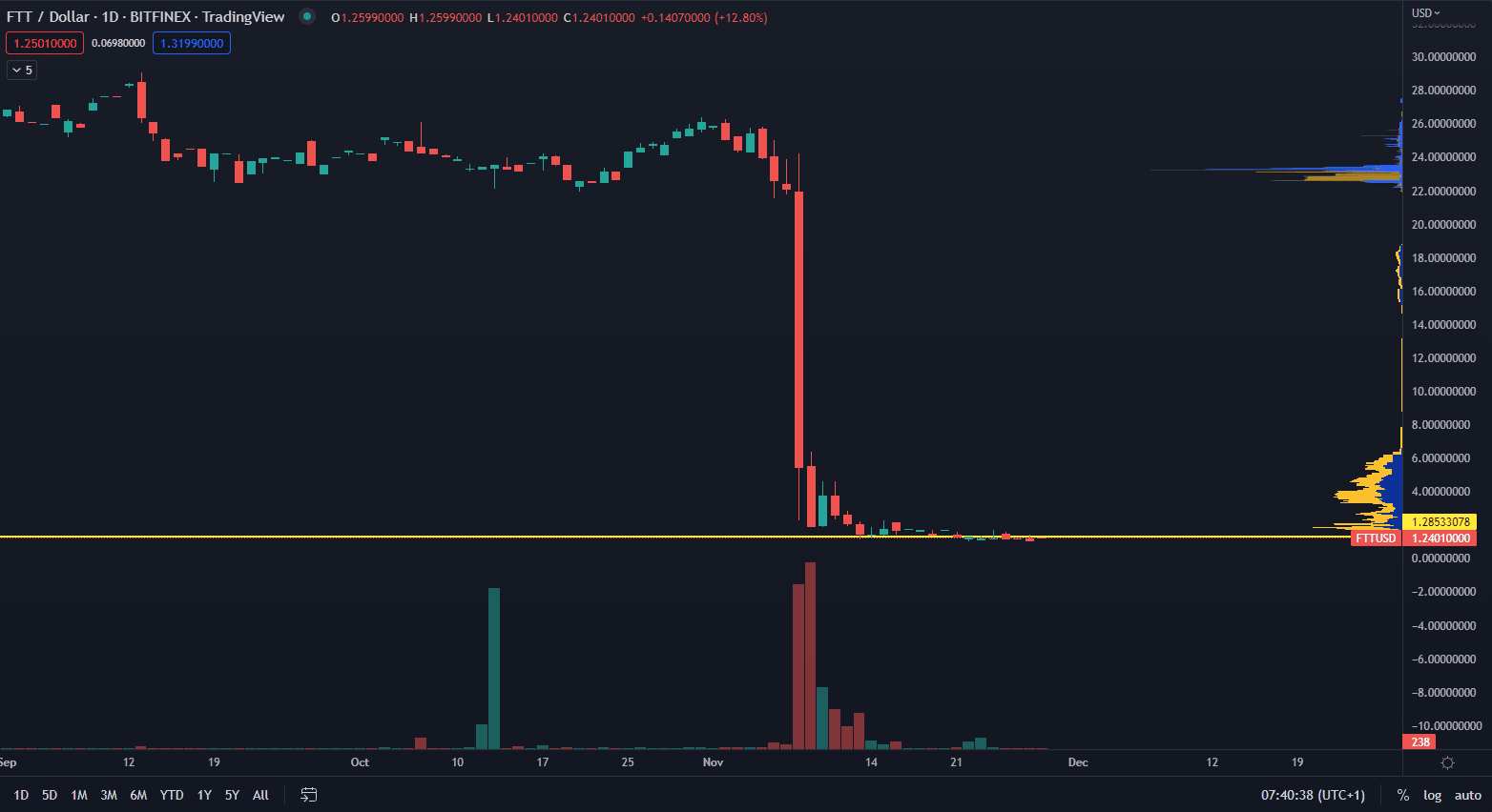 Dňa 29. novembra dosahoval denný objem obchodov s tokenom FTT 5,3 milióna dolárov. Podľa poskytovateľa údajov zo siete etherscan.io 27. novembra existovalo až 24 874 peňaženiek, ktoré vlastnili tento skrachovaný token. Najväčšia peňaženka obsahuje až 195 869 338 FTT, resp. 59,55 % celkovej ponuky.