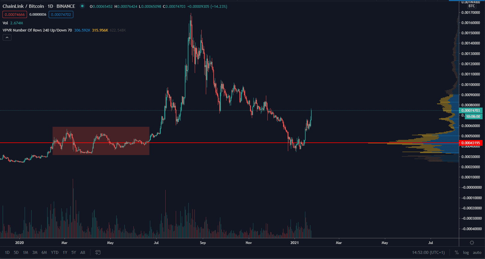 Altcoiny voči BTC sa v posledných týždňoch prebúdzali zo svojho hlbokého spánku, ale zatiaľ sa to nedá nazvať altcoinová sezóna. Výnimkou nie je ani LINK. Altcoiny by pred sezónou mali vytvoriť konsolidačnú štruktúru. Pre Chainlink je takáto akumulácia zobrazená na ľavej strane grafu.