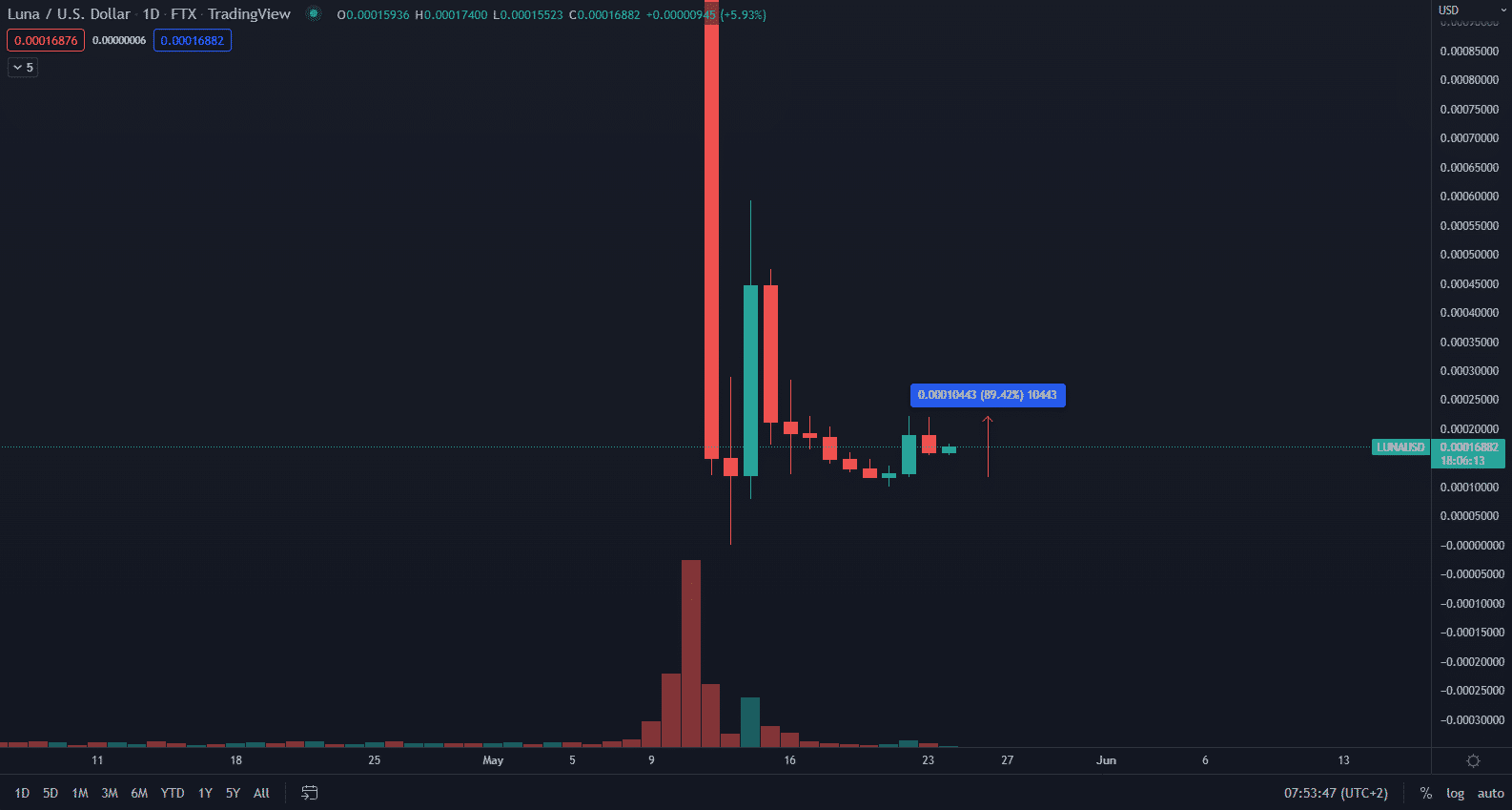 Cena Terra LUNA nedávno vzrástla o 90 % za jediný deň. V súčasnosti sa obchoduje za 0,00016840 $. Nedávne zvýšenie cien je s najväčšou pravdepodobnosťou spôsobené nedávnymi vyhláseniami zakladateľa spoločnosti Terra, Do Kwona, ktorý odpovedal na obvinenia a otázky komunity, ktoré upokojili trh.