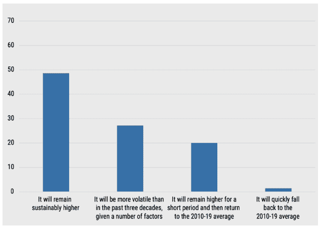 Ak sa pozrieme na výsledky prieskumu, zistíme, že 75 % správcov rezerv centrálnych bánk tvrdí, že inflácia buď zostane vyššia, alebo bude nestála. Prieskum tiež ukazuje, že zhruba polovica verí, že inflácia zostane na vysokých úrovniach. Zaujímavosťou však je, že 20 % stále verí, že inflácia klesne na úroveň z roku 2019 pomerne rýchlo.