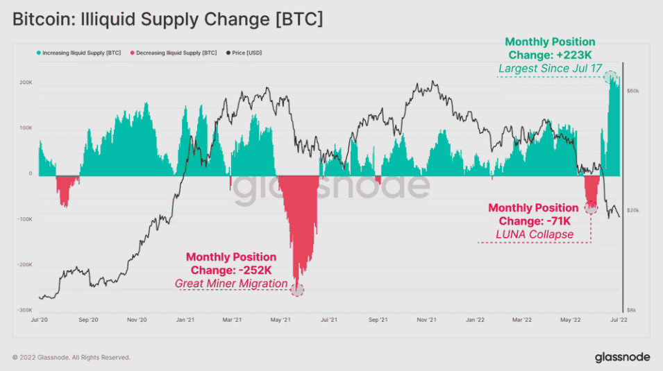 Najväčšiu zaznamenanú zmenu čistej pozície na burze dopĺňa najväčšia zmena nelikvidnej ponuky od júna 2017. Nelikvidná ponuka sa v júli zvýšila o 223 000 BTC, čo odráža veľký pohyb mincí smerom k peňaženkám s malou alebo žiadnou históriou míňania.