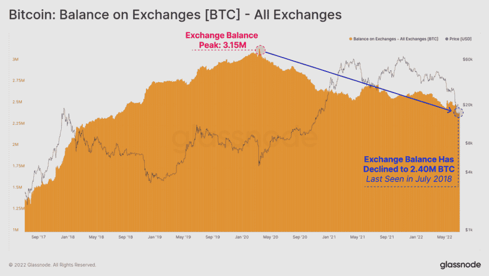 Burzové ​​rezervy naďalej zaznamenávajú veľké výbery, pričom súhrnné zostatky klesajú na úroveň naposledy zaznamenanú v júli 2018. Bitcoin na burzách zaznamenal od marca 2020 odliv až 750 000 mincí. Len za posledné tri mesiace bolo zaznamenaných približne 142 500 BTC v odlivoch, čo predstavuje 18,8 % z celkového počtu. Odlivy v tomto rozsahu, najmä vzhľadom na takýto extrémny pokles cien, sú zaujímavé.