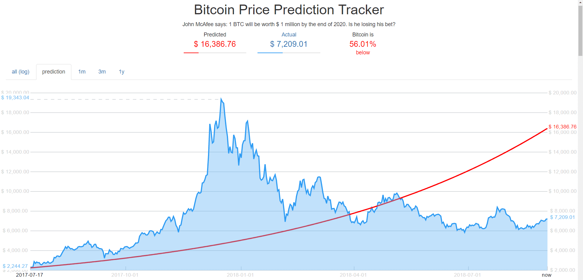 Pri prvom pohľade na predikciu a reálnu cenu Bitcoinu na začiatku septembra je však každému jasné, že niečo nesedí. Predpokladaná cena na 2.9.2018 by mala byť 16 386 $. BTC sa však v súčasnosti pohybuje tesne nad technickou hladinou 7200 $ a podľa odvážnych predpovedí by mohol v priebehu budúceho týždňa prekonať 8000 $. Aj to je však primálo. Reálna hodnota BTC je o takmer 56% nižšia, než by mala byť. McAfee tak čelí reálnej hrozbe, že príde o penis.